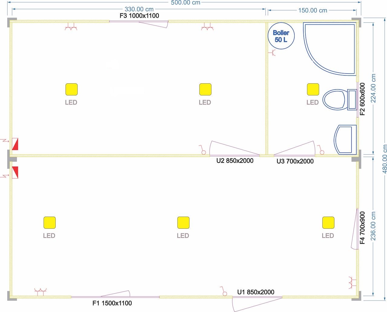 Dimensions (L x W x H): 5.00m × 4.80m × 2.70m